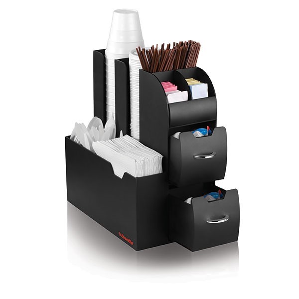 All-in-one compact unit holds many coffee accessories and single serve coffee pods